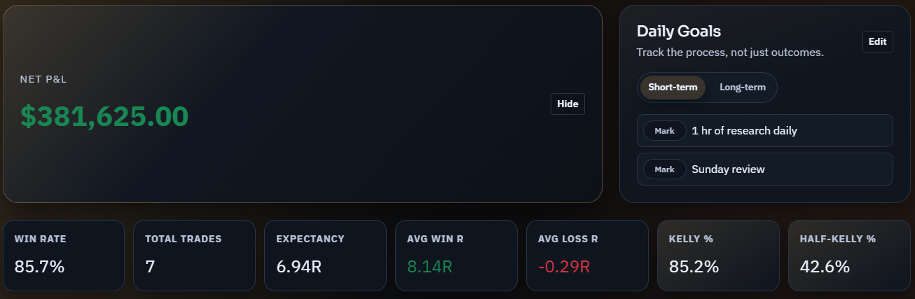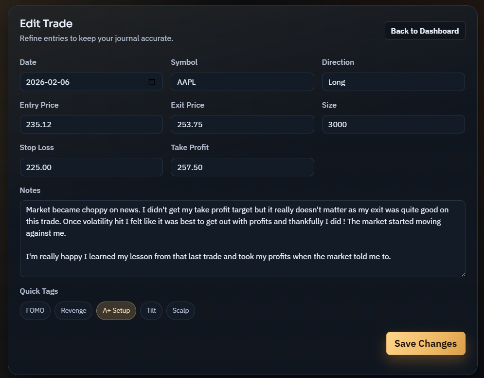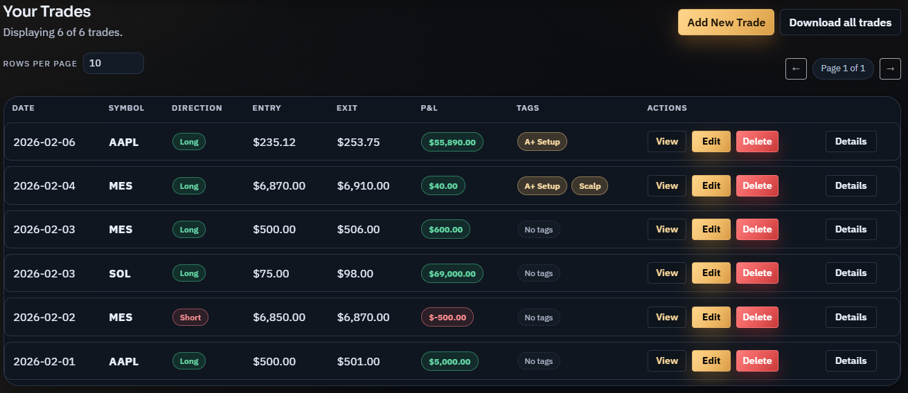 Capture entries, exits, rationale, and outcomes in one disciplined workflow.
